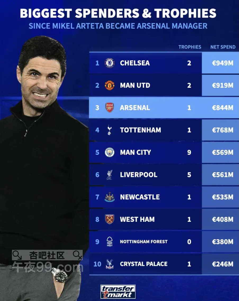 [|足球快报] 自塔帅执教枪手以来英超球队净投入榜:蓝军第一;枪手第三 |